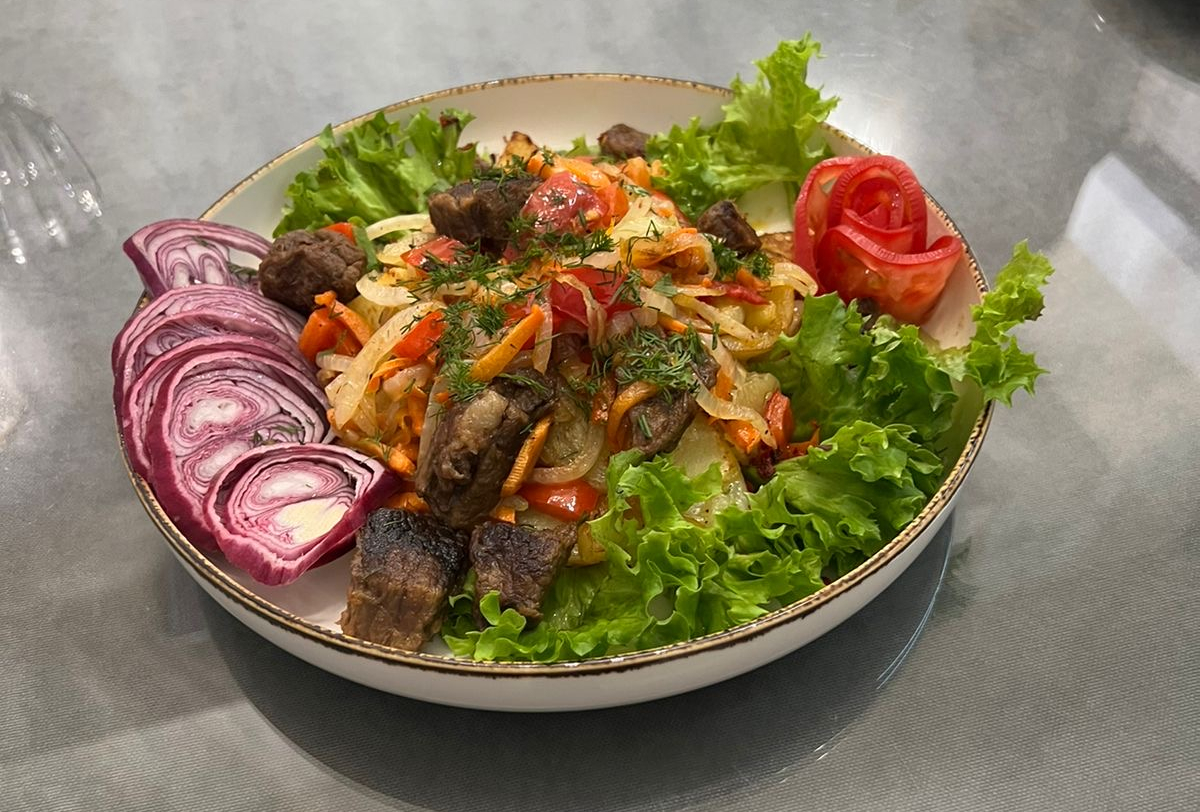 телятина, помидор, зел. лук, сыр, картофель фри